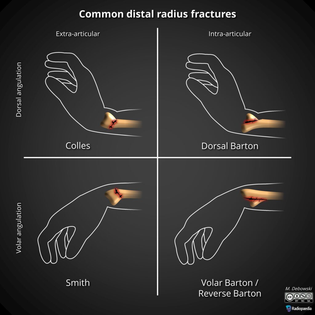 This fracture commonly occurs in patients which have osteoporotic bones (age > 40 years old). The main mechanism of injury is falling on an outstretched hand (FOOSH).