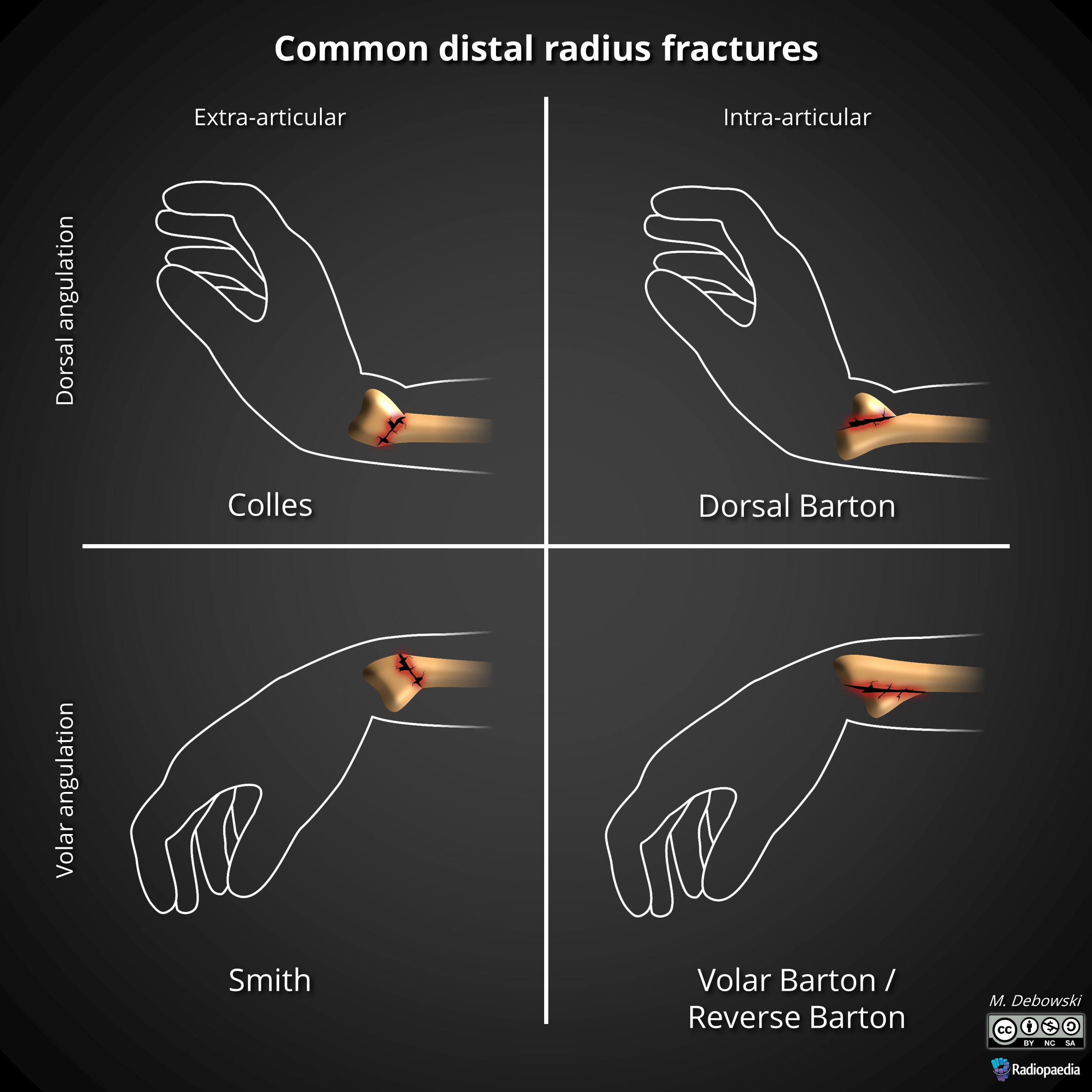 This type of fracture is often described as being an extra-articular transverse fracture of the distal radius with dorsal displacement with/without ulnar styloid fracture. The fracture is usually around 2cm proximal to the radiocarpal joint.