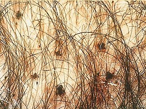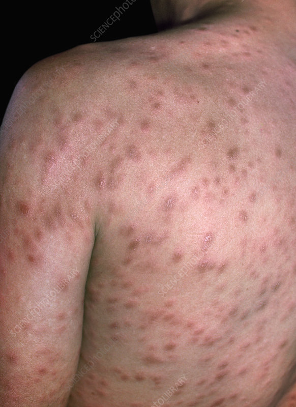 Treatment: Benzyl benzoid 25% lotion applied daily until symptoms subside. Patient should also trim/shave all hair.