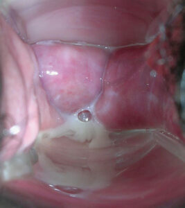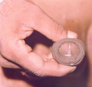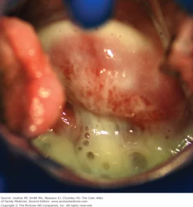 Basic Description: In Males, there is a water white discharge adherent to the glands. In Females, there is a white thick/curd like, very itchy.